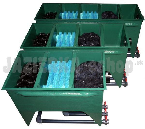 Komory sú radené za sebou a cez médiá voda preteká vždy zdola nahor. Čistenie je veľmi jednoduché, stačí len otvoriť veľký ventil a kal rýchlo bezozbytku odtečie, pretože je každá komora vyspádovaná. Filter pre záhradné jazierko môže byť zapojený gravitačne i čerpadlovej. Pripája sa na bežné potrubie. Vtok a výtok je PVC trubkou 100 mm. Dodávka je kompletná vrátane roštov, filtračných médií, odkalovacích ventilov a veka. Každá komora má svoj 50 mm odkalovací ventil. Jazierkový filter je vyrobený zo silného laminátu. Je testovaný na vodotesnosť.
